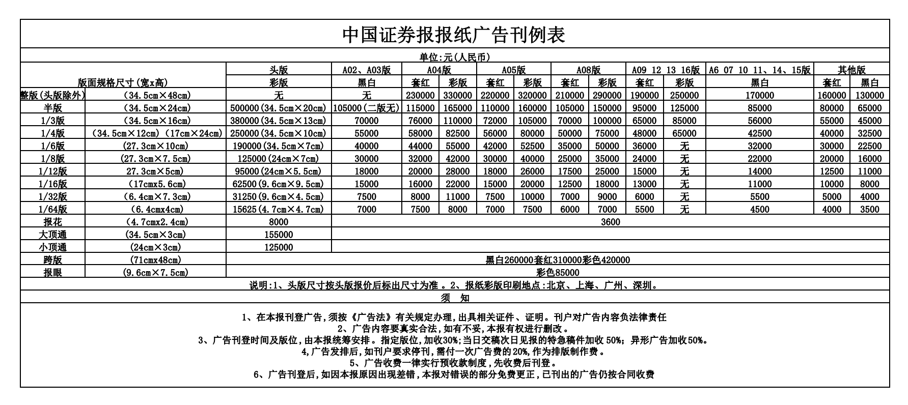点击下载中国证券报广告价目表