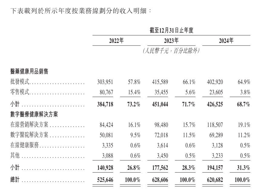 招股书显示,在2022年、2023年及2024年,该公司医药健康用品销售所产生的收入分别为3.85亿元、4.51亿元和4.27亿元,分别占公司总收入的73.2%、71.7%及68.7%。