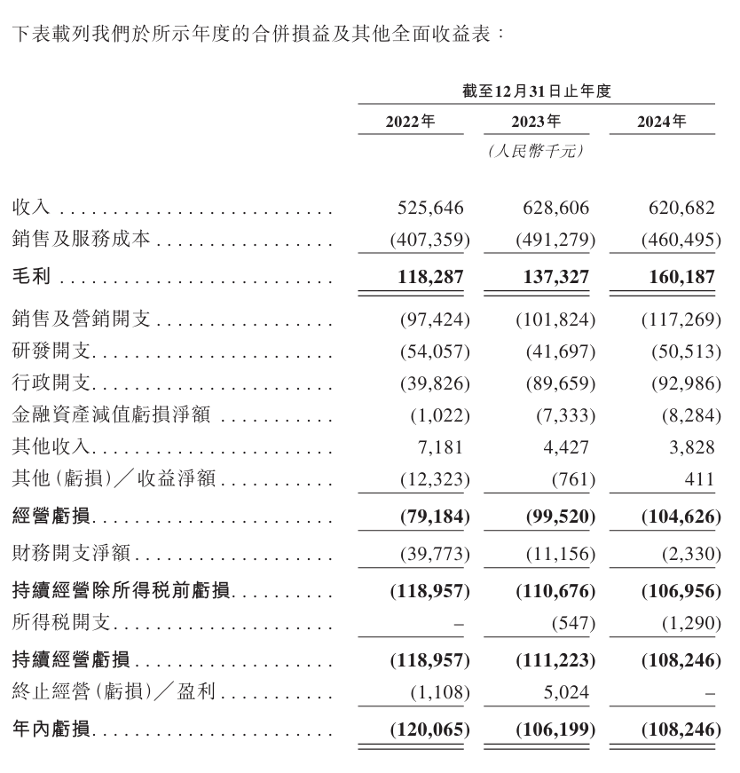 从经营情况看,健康160三年来一直深陷亏损状态。在2022年、2023年及2024年,公司营收分别为5.26亿元、6.29亿元、6.21亿元;同期,公司分别产生年内亏损为1.2亿元、1.06亿元及1.08亿元。