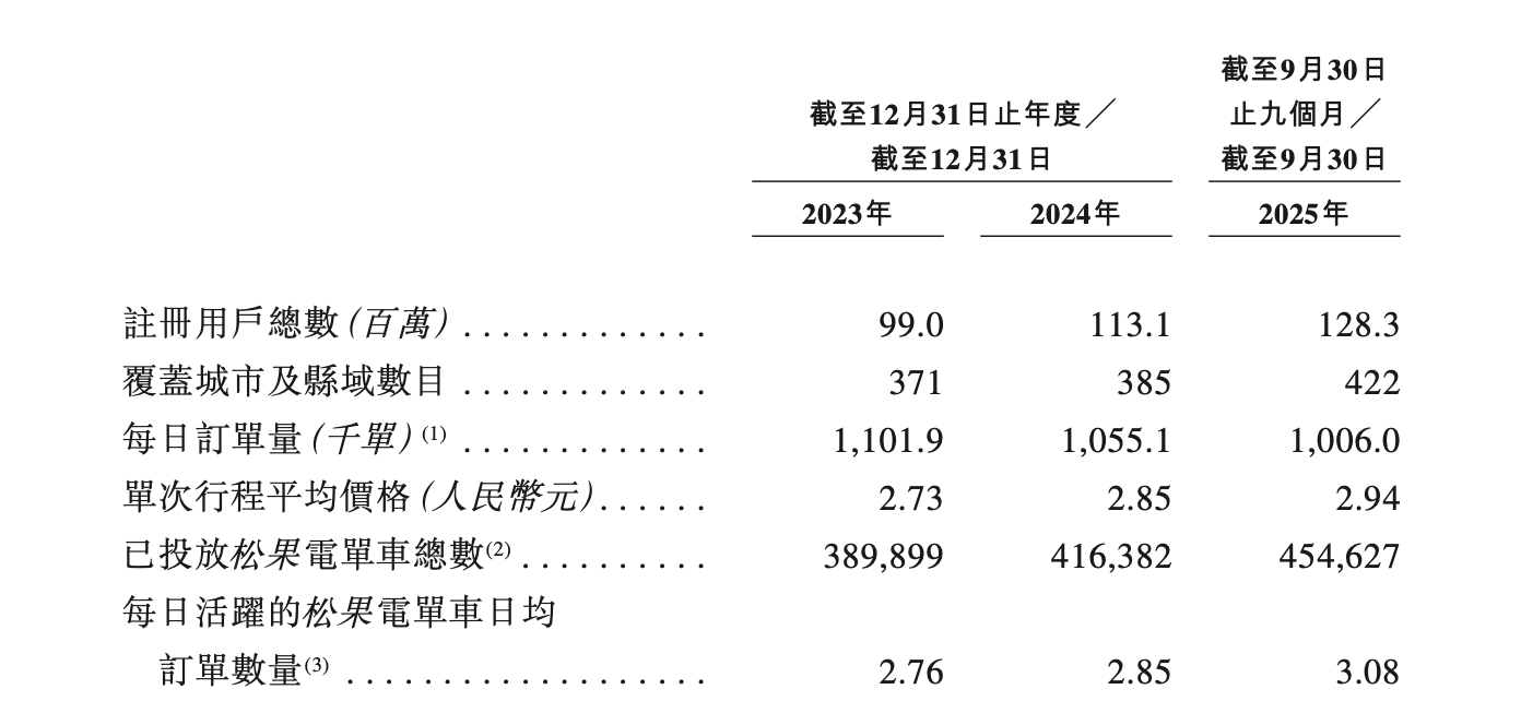 值得注意的是,松果出行上市申请材料显示,公司的每日订单量逐年减少。2023年、2024年及2025年前三季度,松果出行每日订单量分别为110.19万单、105.51万单及100.60万单,平均单次行程价格逐年上涨,分别为2.73元、2.85元及2.94元。