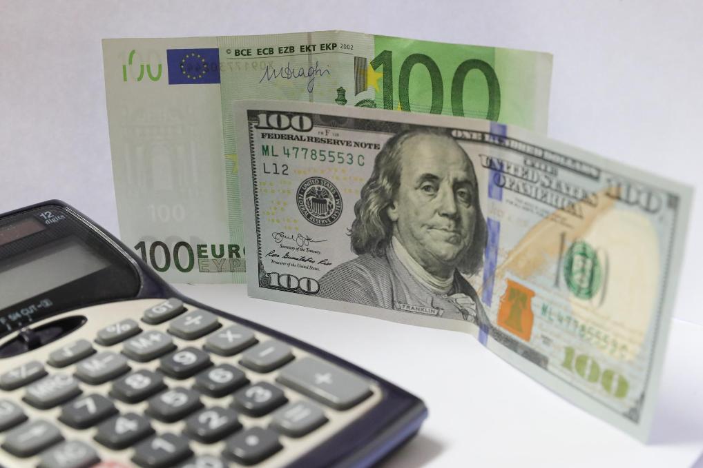 ??这是2022年7月7日在比利时首都布鲁塞尔拍摄的欧元(后)和美元纸币。新华社记者?;浪缮?/span>