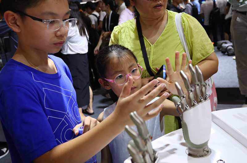 ??7月5日,在2024世界人工智能大会,小朋友在傲意科技机器人灵巧手展品旁参观。新华社记者 方喆 摄