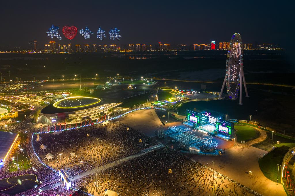 ??人们在哈尔滨国际啤酒节现场观看无人机表演。新华社记者 张涛 摄