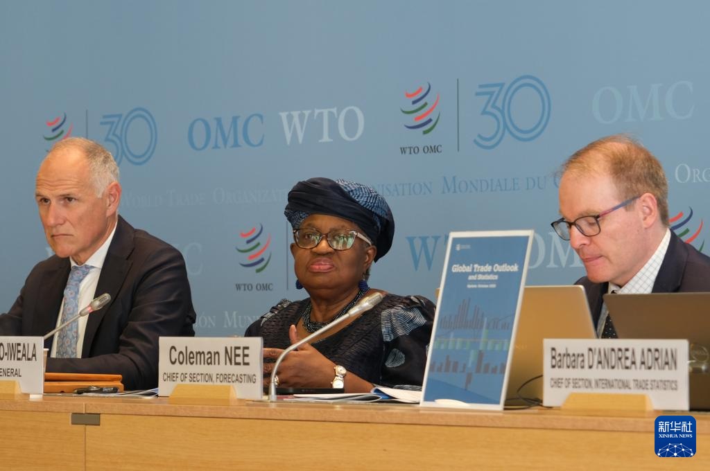 ??10月7日,在瑞士日内瓦世界贸易组织总部,世贸组织总干事伊维拉(中)在新闻发布会上讲话。新华社记者 马汝轩 摄