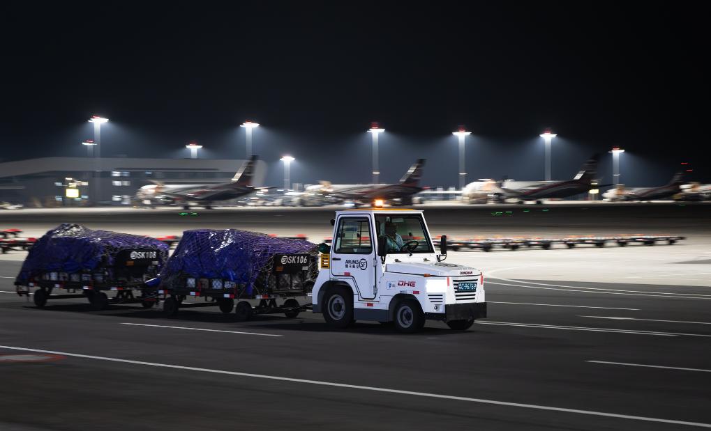 ??子夜时分,记者驱车来到这座机场时,扑面而来的是一派“不夜空港”的繁忙景象:雪亮的?;荷?,货机刚一停稳,工作人员便操控牵引车、加油车、转运车簇拥而上,卸货、加油、检查,井井有条,一刻也不耽误。