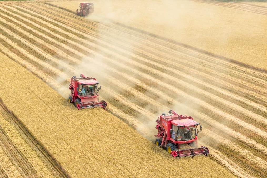 ??2025年6月9日,河南省三门峡灵宝市西阎乡东古驿村村民在抢收小麦(无人机照片)。新华社发(杜杰摄)