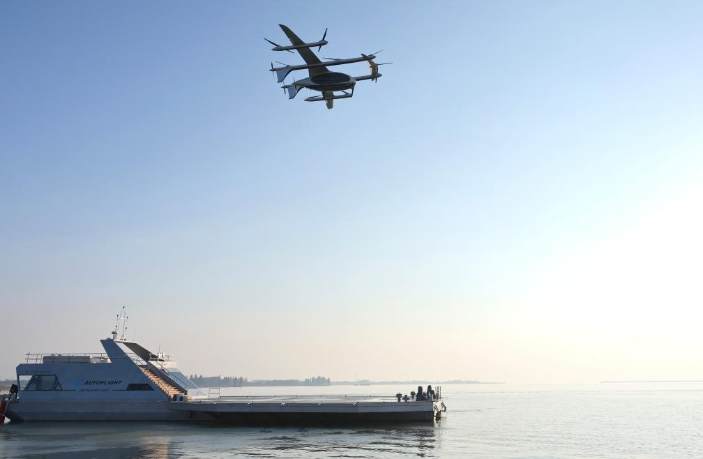 ??2025年11月22日,在江苏昆山的峰飞航空全球科技日活动中,一架电动垂直起降飞行器从“水上机场”起飞。新华社记者 方喆 摄
