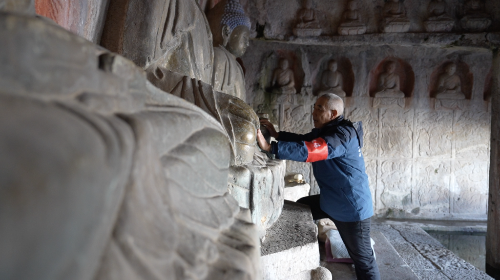 守庙人的日子,冯开平一守就是30年。寺中14个洞窟、500余尊摩崖造像,他都如数家珍,不知巡查了多少遍。他常常给这些自己口中的“老人家”打扫灰尘。